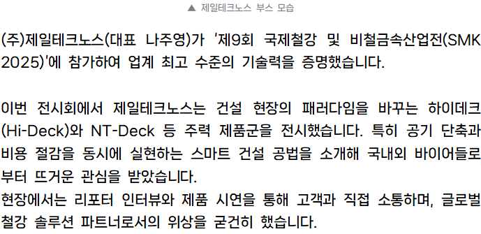 (주)제일테크노스, ‘SMK 2025’ 참가해 혁신 데크 공법 선보여